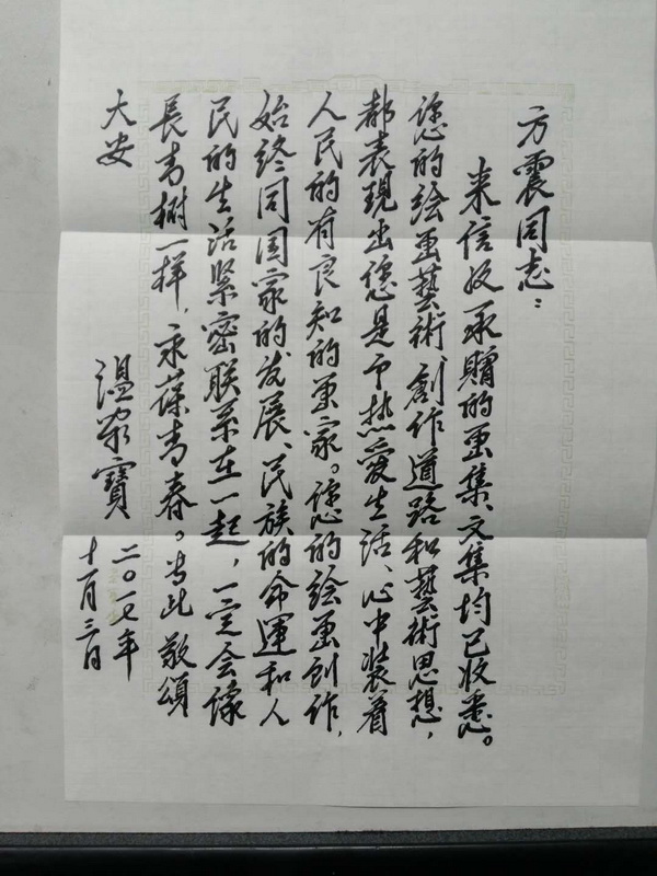 温家宝总理收悉后,亲笔回信张方震老教授,对张老先生在绘画艺术、创作道路和艺术思想上取得的成就倍加赞赏。温家宝来信中写到“您是个热爱生活、心中装着人民的有良知的画家,您的绘画创作,始终同国家的发展、民族的命运和人民的生活紧密联系在一起,一定会像长青树一样,永葆青春。”